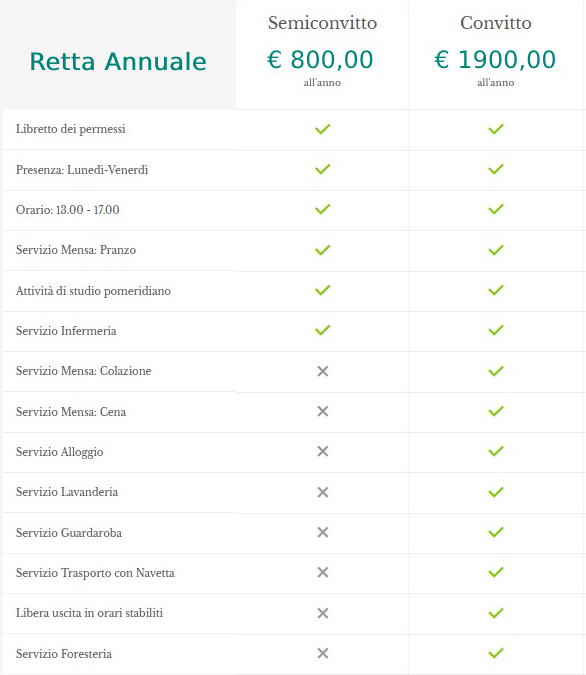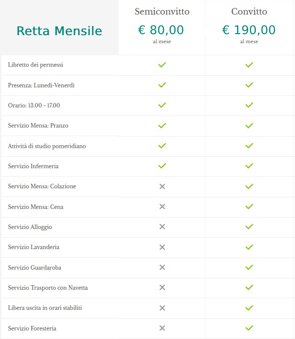 Volendo riassumere in maniera schematica i servizi garantiti dall’iscrizione al Convitto e al Semiconvitto è possibile sintetizzare in questo modo: